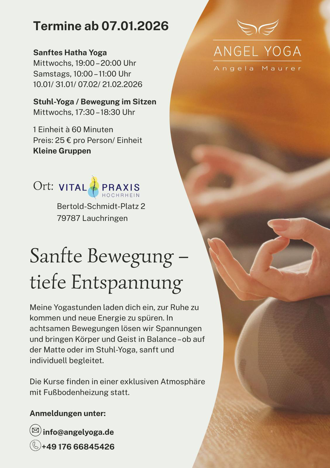 Du hast noch nie Yoga gemacht, und weißt nicht ob es zu dir passt? Du bist schon Yoga erfahren und möchtest meine Arbeitsweise und Unterrichtsstil kennenlernen? Dann ist dies dein Einstieg bei Angel-Yoga-Waldshut! Ich biete dir eine Schnupper-Stunde an, damit wir uns vorab persönlich kennenlernen können.